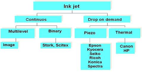 噴墨技術(shù)分為連續(xù)噴墨和按需噴墨(DOD)兩種,前者目前只用在柯達的數(shù)字印刷機上,市場上的絕大部分噴墨打印機都屬于按需噴墨技術(shù),按需噴墨又分為壓電和熱發(fā)泡兩類,熱發(fā)泡噴頭廉價、精度高,但其缺點也是顯而易見的:噴頭壽命短、只適用水性墨水,因之主要用于家庭和辦公室的紙張打??;而壓電噴墨是利用陶瓷加上電壓后會變形的原理,直接將電壓轉(zhuǎn)換為機械壓力,工作在常溫下,也無需溶解在水中的氧氣幫忙,所以不但噴頭壽命長,而且可以適用各種類型溶劑所生產(chǎn)的墨水。