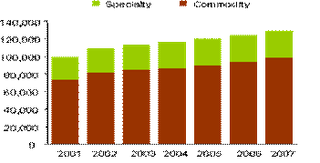 統(tǒng)計(jì)數(shù)據(jù)表明,美國家用電腦和打印機(jī)的普及培育了桌面噴墨打印的市場,2004年噴墨方式輸出的1160億張打印紙中,特殊打印介質(zhì)將近300億張,預(yù)期2002年至2007年間普通噴墨打印紙和特殊打印介質(zhì)均會有穩(wěn)定增長,這段時間內(nèi),噴墨打印介質(zhì)的打印數(shù)量年度遞增率(CAGR)為3.5%。2004年美國整個噴墨介質(zhì)的收入超過32億美元,其中普通產(chǎn)品約17億美元,透明片或其它膠片薄膜產(chǎn)品0.5219億美元,特殊打印介質(zhì)超過13億美元。雖然普通產(chǎn)品(commodity)仍是噴墨打印的主要輸出對象,數(shù)量上占了總噸數(shù)的75%,但由于價格低,其銷售額只占總銷售額的40%。 2005年預(yù)期桌面噴墨打印的總量將超過1202億張,市場份額33億美元。2002-2007年間預(yù)期噴墨打印紙的銷售額年遞增率2.4%。特殊打印介質(zhì)包括彩噴紙(Coated paper),照片打印紙(Photo paper),明信片紙,背膠,油畫紙,標(biāo)簽紙等等。在特殊打印介質(zhì)的增長中,彩噴紙的增長速度相比較慢,而照片打印紙?jiān)鲩L速度很快,預(yù)計(jì)2002-2007年間照片打印紙的年遞增率將高達(dá)16%!這種增長歸功于低價位數(shù)碼相機(jī)的熱銷;低于50美元打印機(jī)的銷售;和數(shù)字圖像傳輸?shù)目旖菪浴?/span>