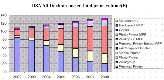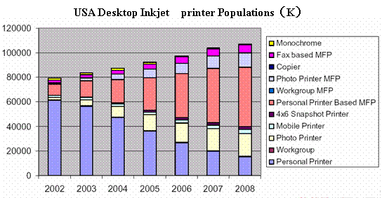 2004年11月15日InfoTrends研究機(jī)構(gòu)發(fā)表的市場調(diào)查結(jié)果表明,2003年美國共安裝了超過8300萬臺桌面噴墨打印設(shè)備,使得噴墨成為桌面打印的主要輸出方式。其中,照片噴墨打印機(jī)裝機(jī)量482萬臺,比02年增加39%。在這里所謂照片打印機(jī)(Photo Printer),是指同時具備照片級彩色輸出性能,數(shù)碼相機(jī)存儲卡插槽,照片級墨盒三種典型特征的打印機(jī)。多功能一體機(jī)(MFP, multifunctional printers or imaging devices)是將打印,掃描,傳真,復(fù)印等功能復(fù)合一體的設(shè)備,其增長的速度也非??欤?003年裝機(jī)量1585萬臺,比02年的1085萬臺增長46%。其中部分MFP除打印,掃描,傳真功能外,還具備照片彩色打印功能,這種增長同時也大大提高了特殊打印介質(zhì)(specialty media)的需求。Infotrends預(yù)期到08年,照片噴墨打印機(jī)的年裝機(jī)量可達(dá)1890萬臺,占總裝機(jī)量的18%,普通MFP高達(dá)4800萬臺,占總裝機(jī)量的45%,帶照片彩色打印功能的MFP1160萬臺,占總裝機(jī)量的11%。而普通型個人噴墨打印機(jī)(Personal Pinter)的裝機(jī)量呈逐年下降趨勢,數(shù)據(jù)表明2003年比02年下降了4.3%,普通個人噴墨打印機(jī)所占比例也逐年減少,預(yù)期08年僅占15%以下。2003-2008年間,噴墨打印機(jī)的總裝機(jī)量CAGR 為5%。