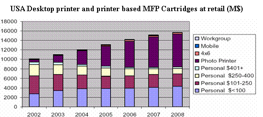 從全美零售市場的數(shù)據(jù)分析, 2003-2008年噴墨墨盒的零售總額年遞增率約8%,其中照片質(zhì)量墨盒的銷售量呈增長勢頭強(qiáng)勁。由于照片噴墨打印機(jī)和具備照片彩色打印的MFP可能使用同一型號墨盒,統(tǒng)計(jì)將兩者合并。普通噴墨MFP也和對應(yīng)的普通個人型打印機(jī)合并。數(shù)據(jù)顯示,2003年用于照片打印的墨盒零售總額19.10億美元,占全年零售總額(107.2億美元)的17.8%, 比02年的6.90億美元增加了177%。2008年, 預(yù)期用于照片打印的墨盒零售總額可達(dá)73.10億美元。對于普通的中高端墨盒零售額,由于受到價格下降和激光打印輸出方式的影響,03年到05年間有明顯下降,05年至08年基本保持不變。而低端的噴墨墨盒一直穩(wěn)中有升。