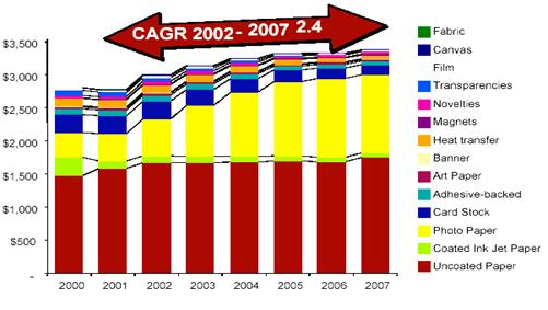 綜上所述, 2003-2008年間,美國噴墨打印將處于快速發(fā)展階段,總裝機(jī)量的年遞增率可達(dá)為5%,與激光,熱升華,熱轉(zhuǎn)印,數(shù)字沖擴(kuò)等方式相比,噴墨以其高品質(zhì)彩色輸出易于實(shí)現(xiàn),成本低,打印方式靈活等優(yōu)勢占據(jù)主流。噴墨照片打印機(jī),噴墨MFP的發(fā)展速度將非??臁?/strong>2002年至2007年間噴墨打印介質(zhì)的打印數(shù)量年度遞增率(CAGR)為3.5%,銷售額年遞增率2.4%。2004年美國整個噴墨介質(zhì)的收入超過32億美元,在特殊打印介質(zhì)的增長中,彩噴紙的增長速度相比較慢,而照片打印紙?jiān)鲩L速度很快,預(yù)計(jì)2002-2007年間照片打印紙的年遞增率將高達(dá)16%。這種增長歸功于低價位數(shù)碼相機(jī)的熱銷;低于50美元打印機(jī)的銷售;和數(shù)字圖像傳輸?shù)目旖菪?。用戶在選擇打印介質(zhì)時,輸出圖像的品質(zhì)是首要考慮因素。