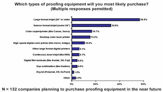 2004年1月市場研究公司InfoTrends發(fā)表的CAP ventures和“Digital Output Magazine” 聯(lián)合開展的公司用戶調(diào)查結(jié)果,回答近期內(nèi)公司準(zhǔn)備采購何種數(shù)碼打印設(shè)備時,56.8%的公司準(zhǔn)備采購超過24英寸的寬幅噴墨打印機(jī),32.6%的公司準(zhǔn)備采購桌面噴墨打印機(jī),桌面彩色激光打印機(jī)的采購傾向用戶15.2%, 可見噴墨在該領(lǐng)域占主導(dǎo)地位,這種狀況在一定時間內(nèi)延續(xù)下去。