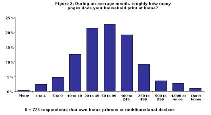 2003年8月CAP Ventures 通過對全美網(wǎng)上擁有家庭打印機(jī)的用戶進(jìn)行打印習(xí)慣調(diào)查,共有超過700名用戶參與調(diào)查并做有效回答,用戶使用打印機(jī)的頻率和打印張數(shù)下圖所示: