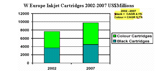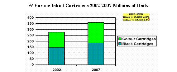 CAP Ventures 2003年對西歐市場的調(diào)查結(jié)果顯示,2002-2007年間,預(yù)期彩色噴墨墨盒的銷售數(shù)量年遞增率將達(dá)6.5%, 從2002年的1.26億個增加到2007年的1.72億個。而黑墨墨盒的年遞增率4.8%, 略低于彩墨增長率。銷售額的年遞增率則為黑墨 4.1%,彩墨5.7%。2002年彩墨墨盒的銷售額約40億美元,2007年可望達(dá)到52億美元。