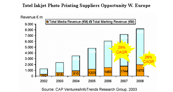 耗材方面2003年西歐市場照片噴墨打印介質(zhì)的收入為6.15億歐元,而整個照片打印介質(zhì)加墨水的收入為17.13億歐元。 2008年照片打印介質(zhì)收入預(yù)期可達(dá)19.70億,CAGR高達(dá)26%。照片介質(zhì)加墨水銷售收入可望達(dá)62.05億歐元,CAGR29%。