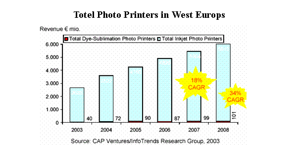 Infotrends /CAP Ventures 2004年2月的調(diào)查顯示, 2003年整個西歐照片噴墨打印機(jī)的市場銷售額為26.33億歐元,而熱升華打印機(jī)的銷售額僅0.40億歐元,2008年照片噴墨打印機(jī)的市場銷售額可望達(dá)到59.10億歐元,每年遞增率18%,熱升華1.01億歐元,由于基數(shù)小每年遞增率達(dá)34%。