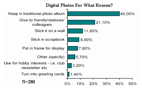 至于影像的輸出問題,兩種不同的打印方式同時占據(jù)市場并共同發(fā)展。一是用戶自己在家打印,從拍攝到輸出,全部自己搞掂。第二是通過專業(yè)連鎖店(在線或不在線)或零售打印店打印“照片”。對于輸出的影像,40%的用戶仍象傳統(tǒng)感光照片一樣將之保存在相冊中,21.1%的用戶將照片贈給親友或同事。